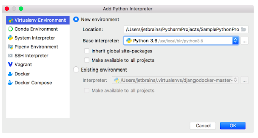 In the left-hand pane of the Add Python Interpreter dialog, select Virtualenv Environment. The following actions depend on whether the virtual environment existed before.